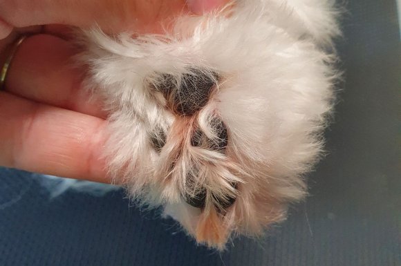 Pendant le toilettage nous dégageons les poils des coussinets, pour éviter l’apparition des nœuds, car les nœuds empêchent la peau de respirer et il peut apparaitre des rougeurs.